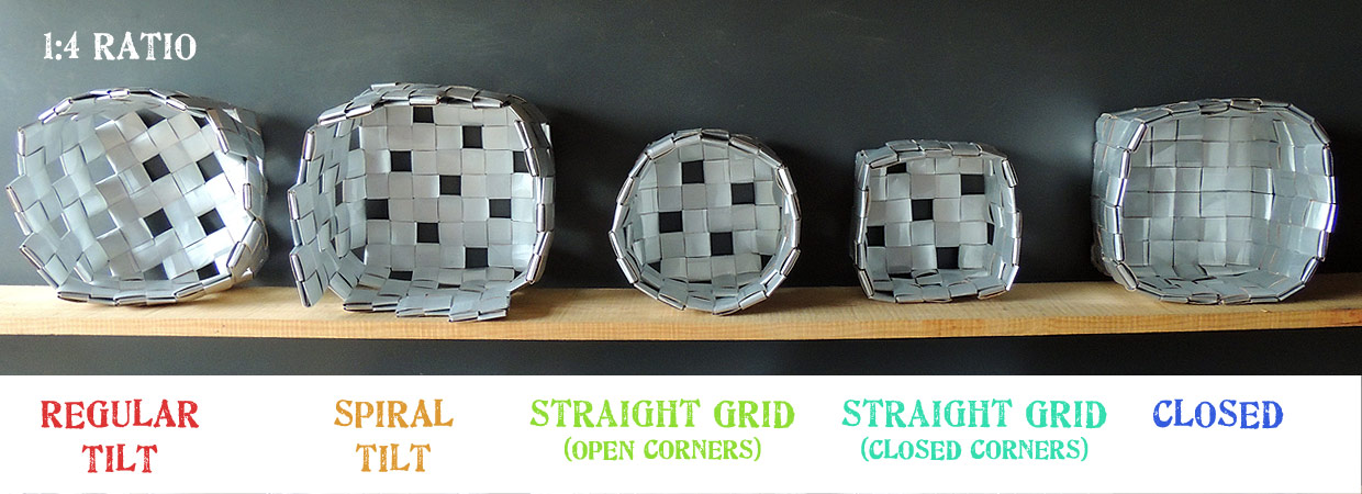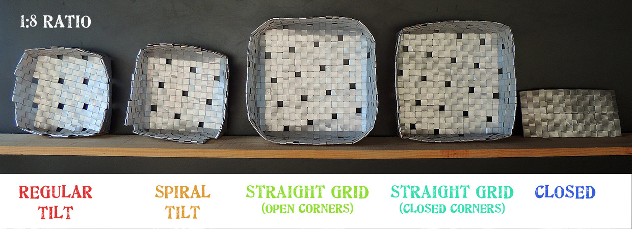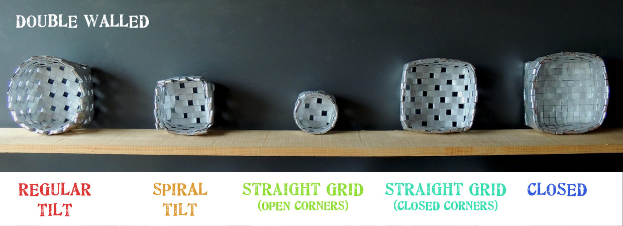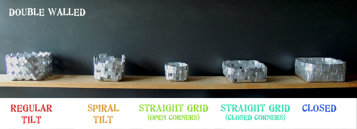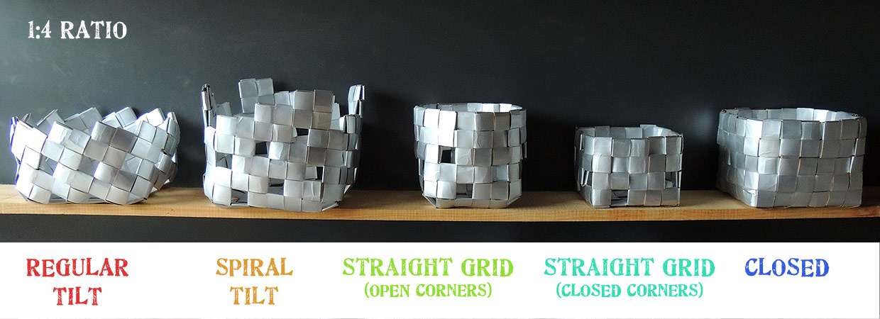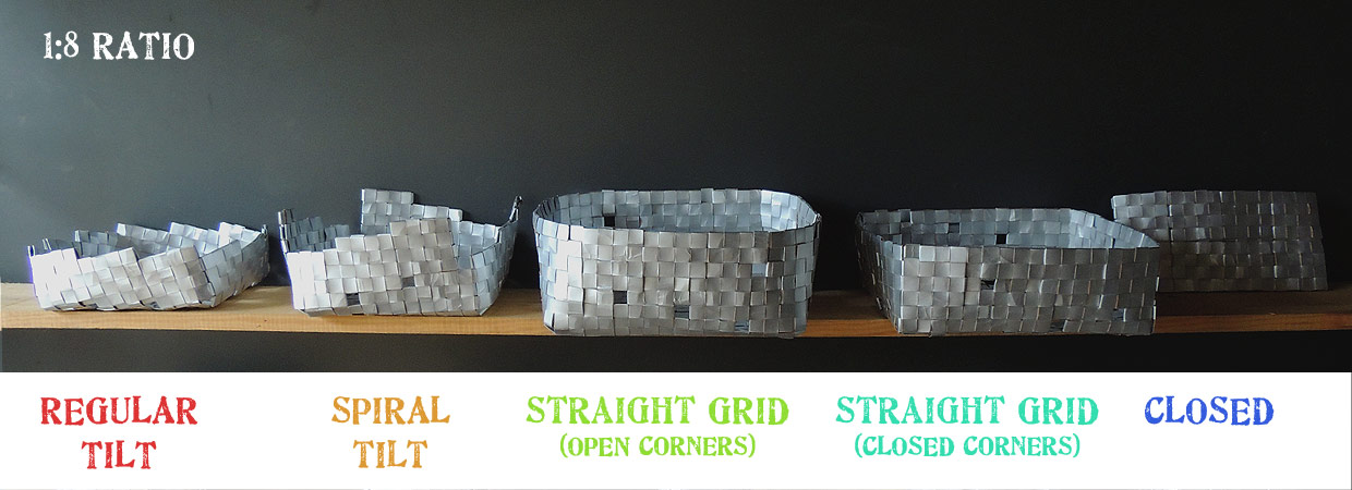 Examples are shown using the same type and size of carton and direction of weave (clockwise) to give idea of comparative size. I have attempted to make a container shape where possible with the aim of ‘turning a corner’.